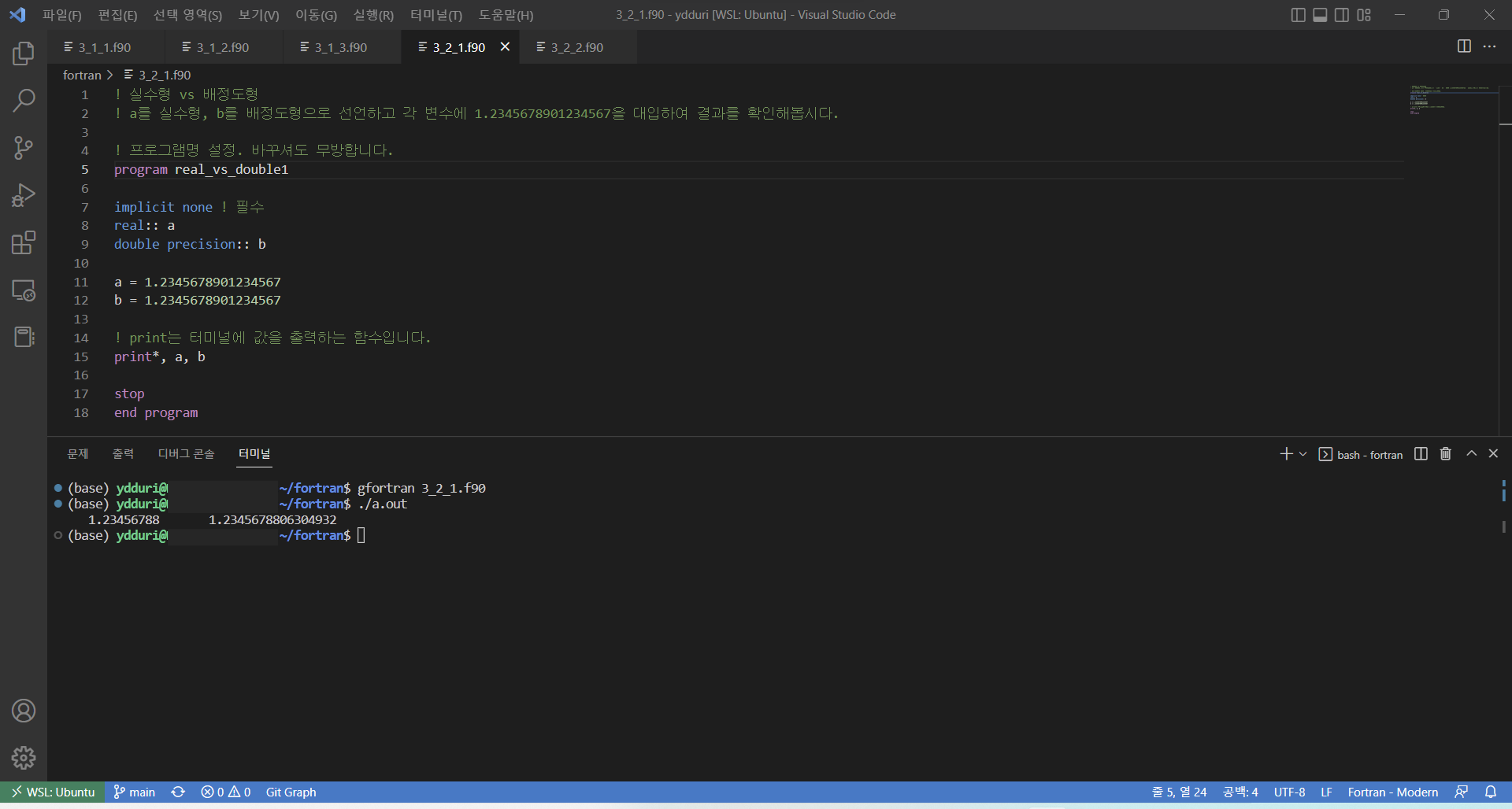 1) 실수형과 배정도형의 출력 결과 차이를 직접 확인해보자! 1탄(3_2_1.f90)