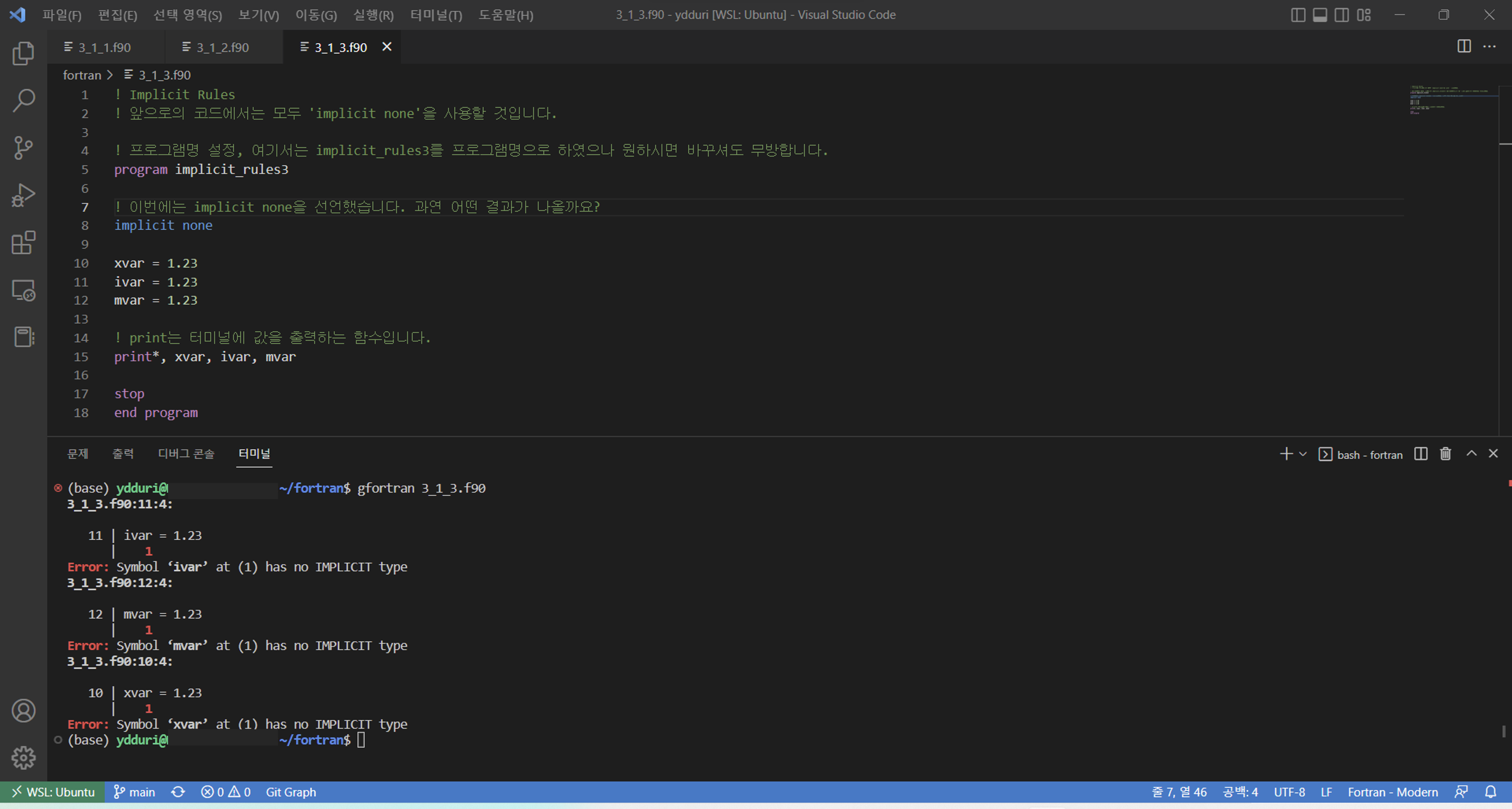 세 번째로, 해당 implicit문을 앞으로 우리가 계속 활용할 'implicit none'으로 수정하여 컴파일 해보자.