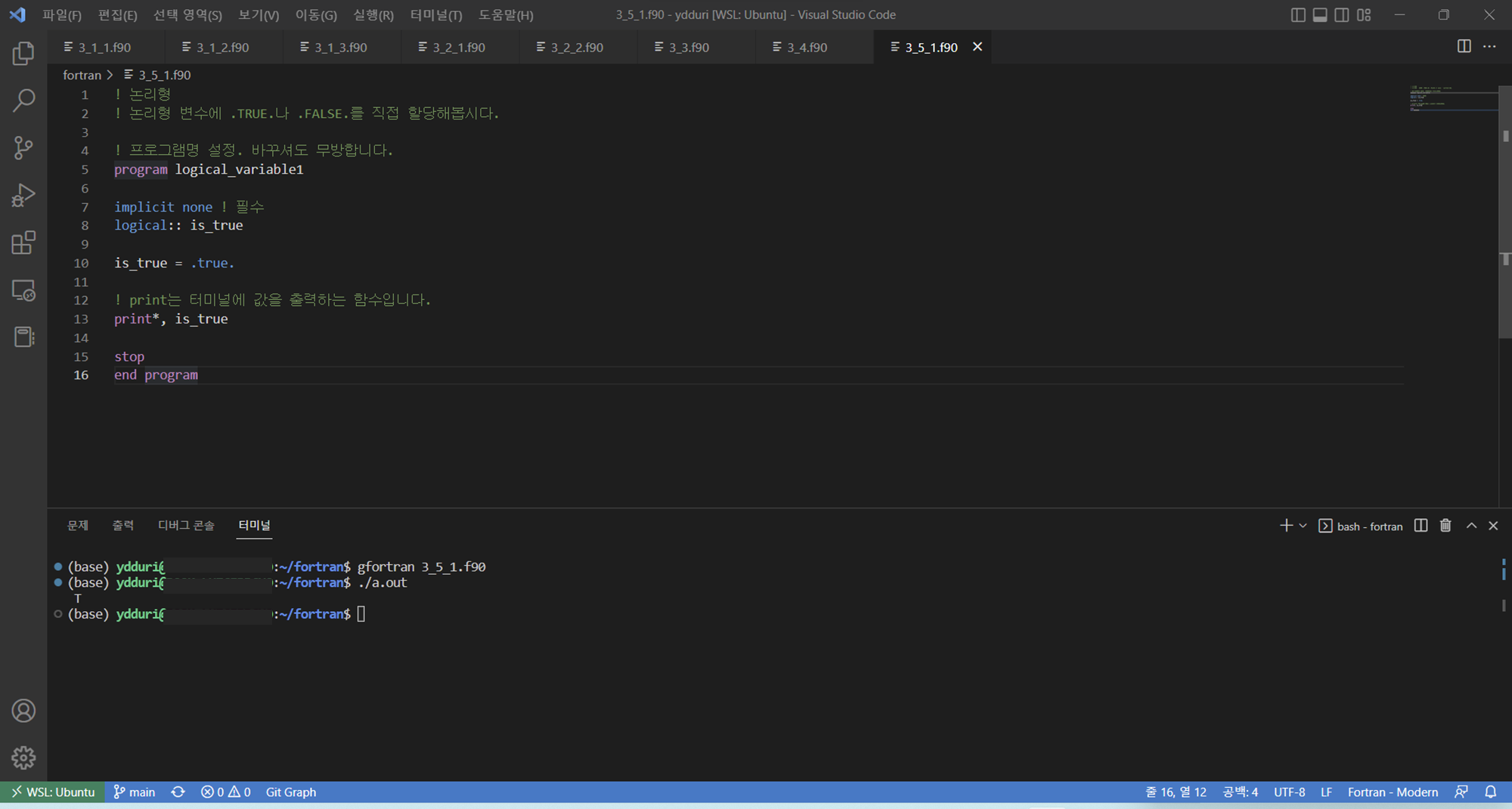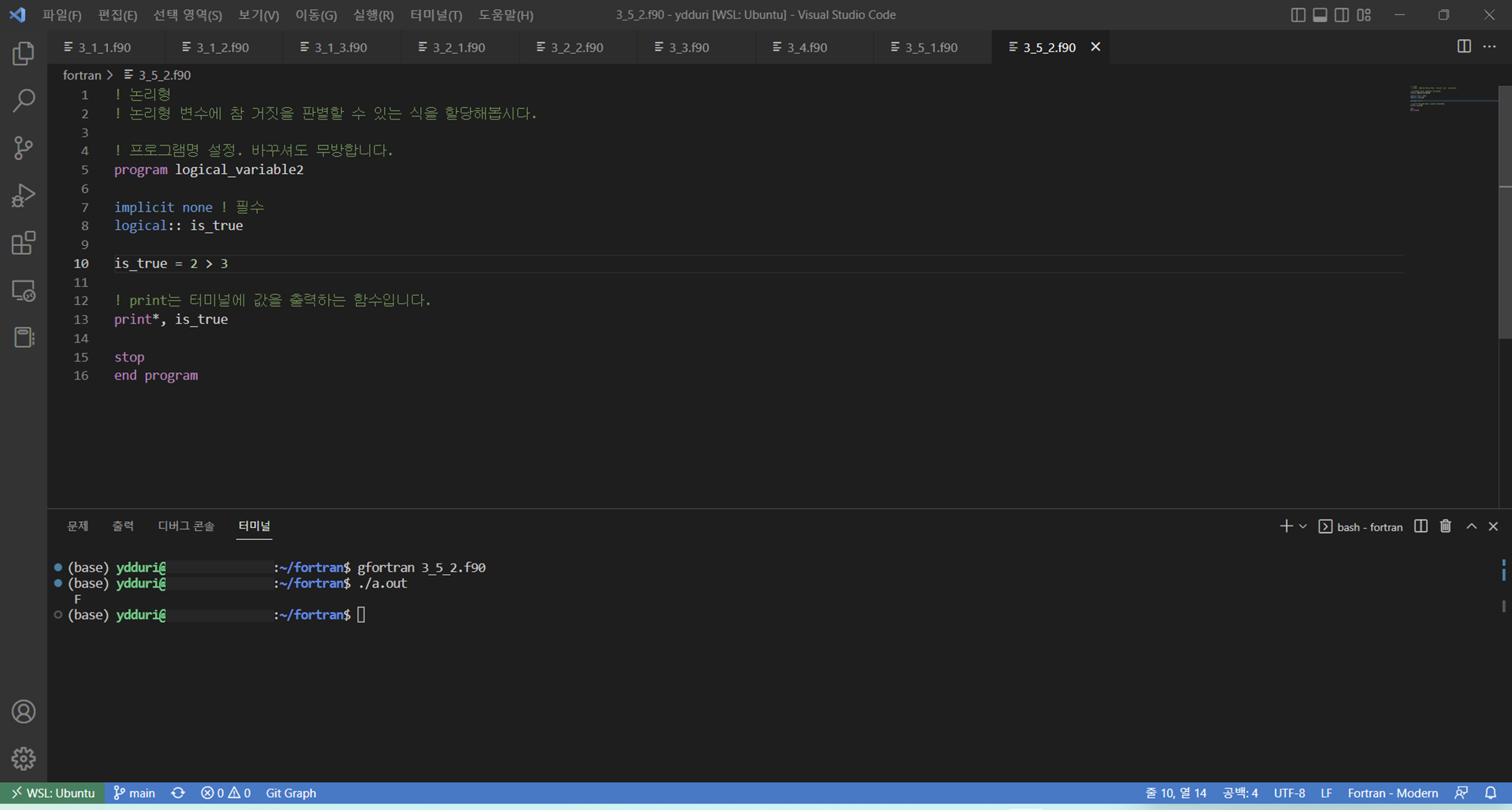 논리형 변수 is_true에 .true.를 할당하고 is_true를 출력해봤더니 참이라는 의미의 T가 출력된 것을 볼 수 있다.