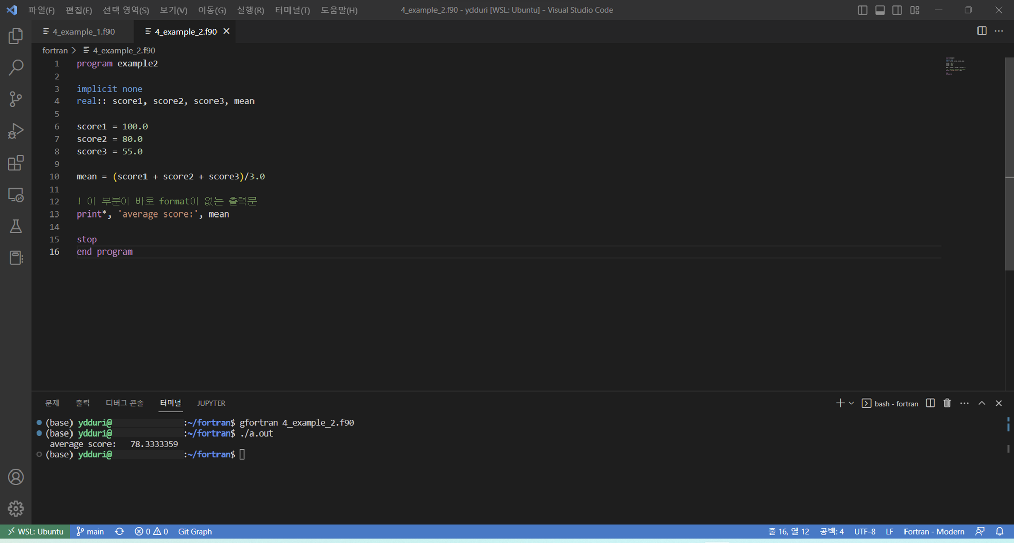 아래 코드의 경우 score1, score2, score3 세 개의 시험 점수의 평균을 mean이라는 변수에 저장한 뒤 출력하도록 하였다. average score: 라는 문자열과 계산된 mean 값이 함께 출력되어 다음과 같은 결과가 나온다.(4_example_2.f90)