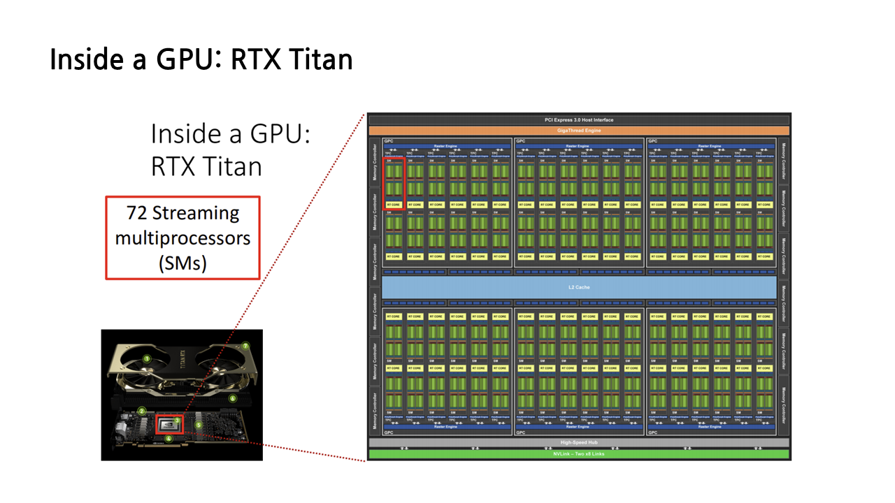 다시 프로세서의 내부를 들여다보면, 아래 그림과 같이 엄청난 수의 computing elements가 그리드 형태로 나열된 모습을 볼 수 있다. 이때 빨간색 박스로 표시된 부분이 NVIDIA GPU의 core computing elements의 단위라 할 수 있는 Streaming multiprocessor(이하 SMs)이다. RTX Titan의 경우 72개의 SMs로 구성되어 있다.