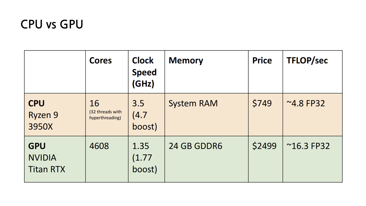 아래 표에서 볼 수 있다시피, CPU는 GPU에 비해 코어 수가 현저히 적다. 하지만 코어 당 clock speed가 크기 때문에 각각의 코어가 빠르고 강력하게 연산을 수행해낼 수 있다. GPU는 코어 당 clock speed는 상대적으로 작아 코어 낱개로만 봤을 때는 CPU 코어보다 성능이 현저히 낮지만, 코어의 수를 무지막지하게 늘림으로써 이를 해결한다. 따라서 CPU는 코어 당 성능이 중요한 연속적인 작업에서, GPU는 여러 코어를 사용하는 것이 가능한 병렬적인 작업에서 강점을 발휘한다.