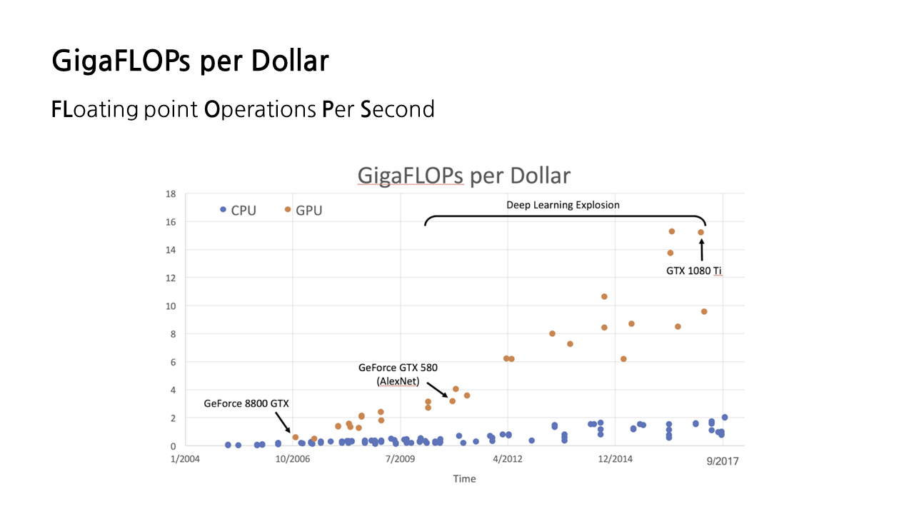 아래 그래프에서 파란색 점이 CPU, 주황색 점이 GPU인데, 시간이 지남에 따라 둘 다 비용 대비 성능이 좋아지지만, 특히 GPU가 2012년 부근에서 드라마틱하게 좋아지는 것을 볼 수 있다. 그중에서도 눈여겨봐야 할 AlexNet은 딥러닝 성능 향상의 돌파구를 제시한 모델인데, 이것이 GPU 기반에서 구동되었다.