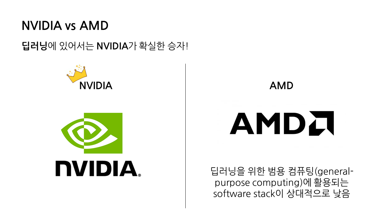 NVIDIA와 AMD는 하드웨어계의 유명한 라이벌이지만, 딥러닝 분야에 있어서는 승자가 확실하다. 바로 NVIDIA다. AMD의 경우 딥러닝을 위한 범용 컴퓨팅(general-purpose computing)에 활용되는 software stack이 NVIDIA의 것만큼 발전하지 못했기 때문에 딥러닝을 할 때는 NVIDIA의 hardware가 보편적으로 사용된다. 딥러닝에서 GPU라 하면 사실상 NVIDIA GPU라고 보면 된다.