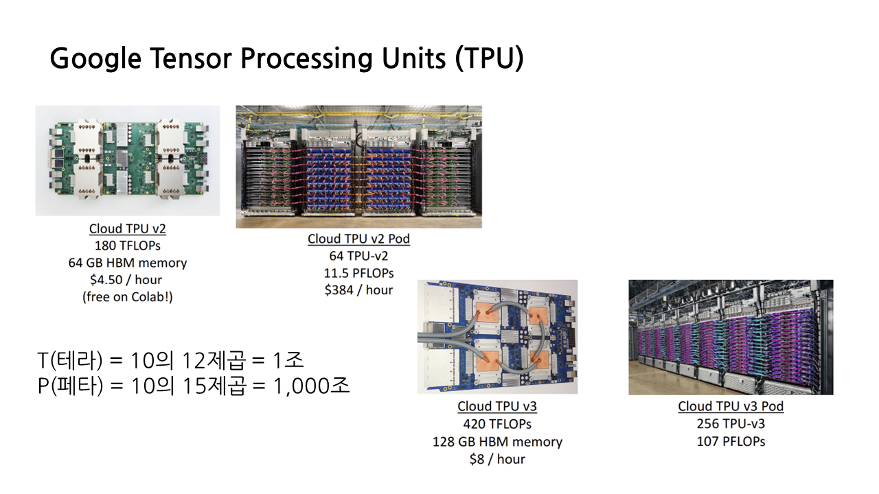 이때 딥러닝 하드웨어계의 신성이 등장한다. 바로 구글이 자신들의 특별한 하드웨어 device, TPU를 개발하여 나타난 것. 특히 TPU는 단독으로 사용하기보다 여러 개를 assemble하여 사용하는 경우가 많은데, 이를 ‘TPU pod’이라 한다. 단일 TPU와 TPU pod의 FLOPs를 비교했을 때 테라에서 페타로 아예 단위가 바뀐 것을 볼 수 있다.