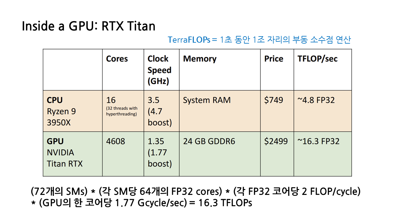 앞서 하드웨어의 성능을 나타내는 지표 중 하나로 초당 얼마나 많은 부동 소수점 연산을 할 수 있는지를 나타내는 FLOPs라는 단위를 소개했었는데, 이 지표를 결정하는 것이 바로 FP32 core의 개수이다. 실제로 앞서 표에서 NVIDIA Titan RTX GPU의 TFLOPs(테라플롭스)가 16.3 정도 된다고 나온 바 있는데, 이는 다음과 같은 방식으로 계산된 값이다.
