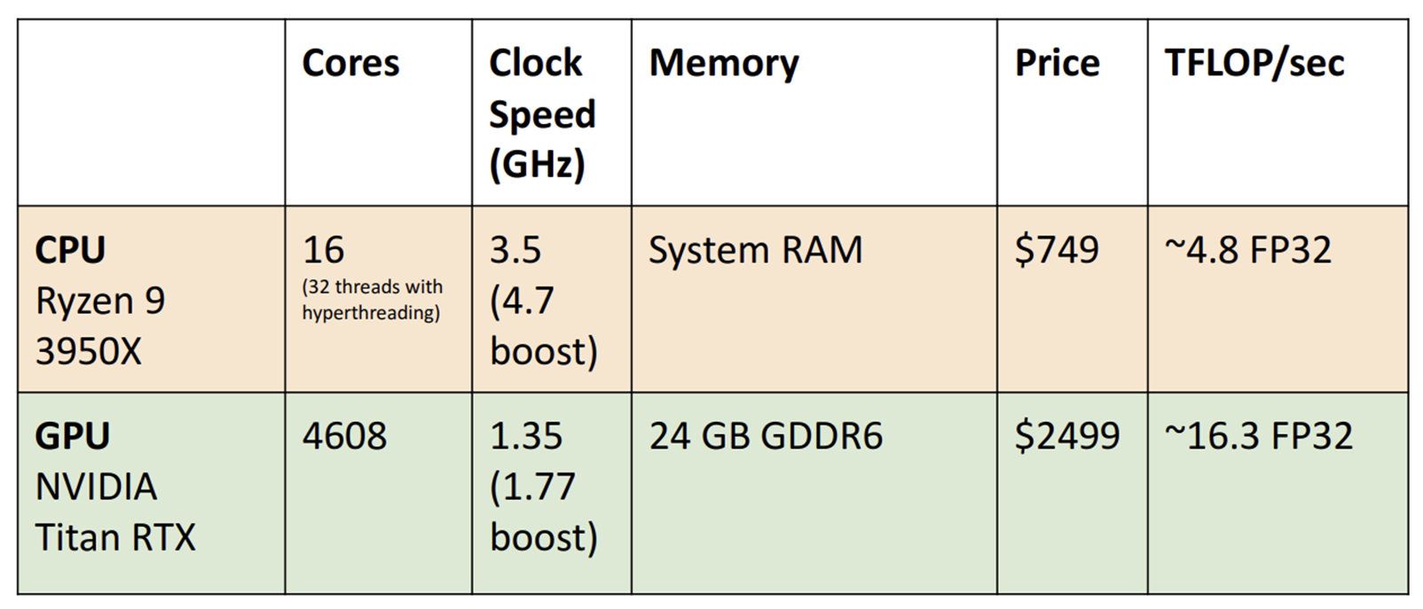 Question. 코어 당 성능으로 보면 CPU가 GPU에 비해 더 좋다고 했는데, 하드웨어의 성능을 나타내는 지표 중 하나인 TFLOPs는 왜 GPU가 더 좋은가?