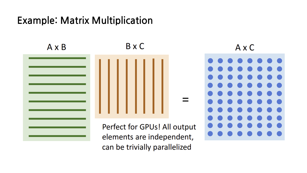 앞서 CPU와 GPU의 아키텍처 차이에 대해 설명하면서 CPU는 코어 당 성능이 중요한 연속적인 작업에, GPU는 여러 코어를 사용하는 것이 가능한 병렬적인 작업에 유리하다고 소개했는데, 행렬곱이 바로 병렬적인 작업의 대표적인 예시이다. 행렬곱 output의 원소들은 모두 독립적이기 때문에 병렬 계산을 수행해도 상관이 없습니다.