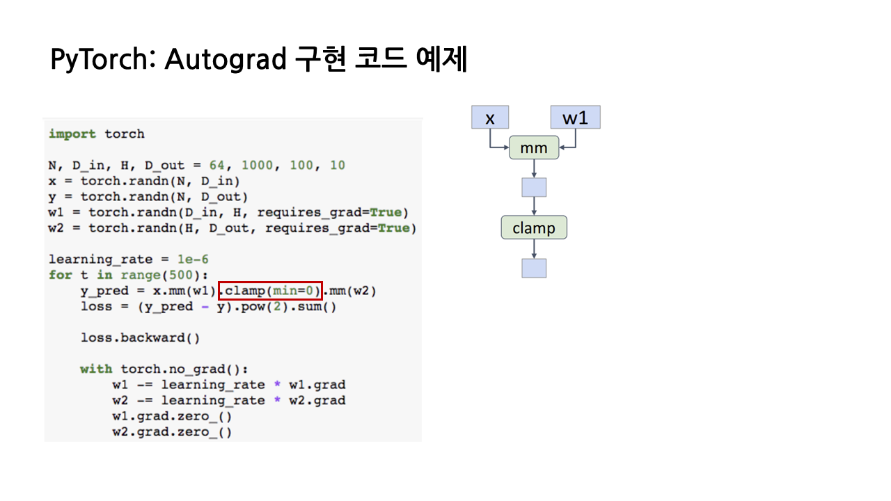 (2) Autograd의 특징은 'requires_grad = True'가 포함된 input이 관여하는 모든 연산에 대해 computational graph를 그린다는 것이다. 이제 x와 w1의 행렬곱 결과에 clamp 함수를 쓰게 되는데, 이 또한 w1이 관여하는 연산이므로 graph를 추가해준다.
