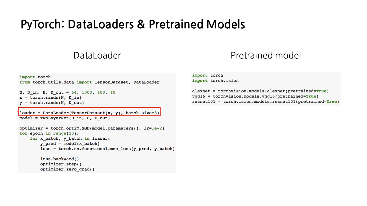 그밖에도 PyTorch에서는 아래와 같이 데이터를 로딩하고, mini batch를 생성하고, 데이터를 섞는 등의 기능을 제공해주는 dataloaders 메커니즘을 사용할 수도 있고, 사전 훈련된 pre-trained model을 제공하기도 합니다.
