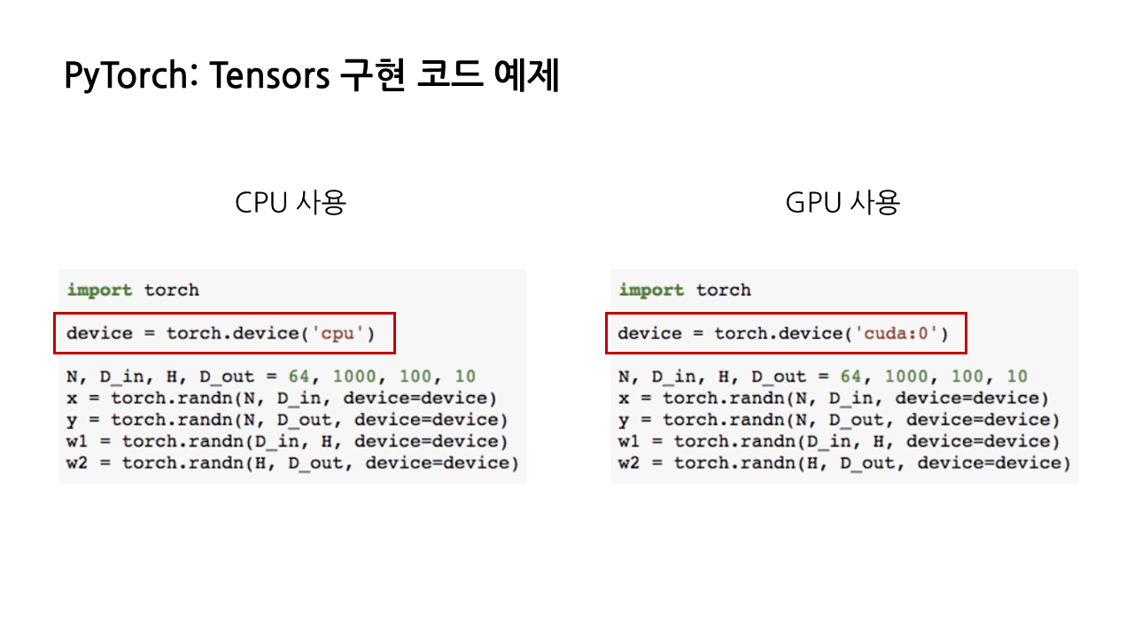 CPU를 사용할지, GPU를 사용할지는 다음과 같이 tensor 선언 시에 원하는 디바이스를 지정해주면 된다.