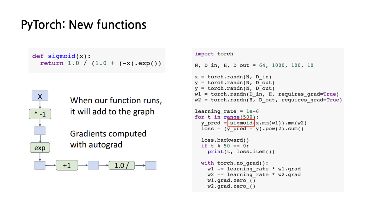 지금까지는 행렬곱이나 clamp처럼 PyTorch에서 기본적으로 제공하는 연산자를 이용해 y값을 예측했는데, PyTorch의 강점 중 하나는 임의의 파이썬 함수에 대해서 확장이 가능하다는 것이다. 아래 그림에서 볼 수 있듯이, 만일 우리가 왼쪽과 같이 파이썬 함수를 이용해 sigmoid 식을 정의한다면, 우리는 y값을 예측하는 부분을 이렇게 sigmoid 함수로 대체할 수 있다.