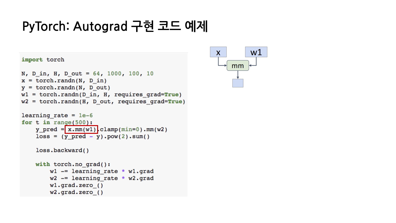 예를 들어, 아래 그림에서 x와 w1 사이의 matrix multiplication을 계산하는 빨간 박스 코드를 수행할 때, w1이 'requires_grad = True'로 선언된 input이므로 오른쪽과 같은 computational graph를 그리기 시작한다.