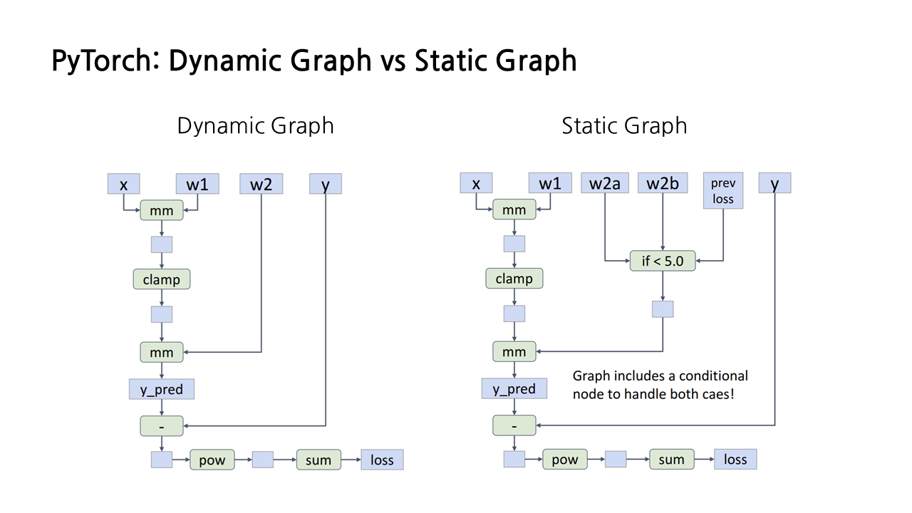 앞서 PyTorch에서 Autograd 구현 예제를 설명하면서, 반복을 한 번 할 때마다 forward pass를 통해 computational graph를 그리고, backward pass를 통해 loss를 찾고, loss를 불러오고 나면 그래프를 지우고, 다음 epoch을 반복하는 과정을 설명 했는데, 이를 ‘Dynamic Computation Graph’라 한다.