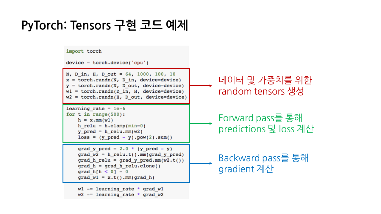 - 빨간색: 데이터 및 가중치를 위한 random tensors 생성하는 부분(뒤의 코드에서 실제 값으로 대체)