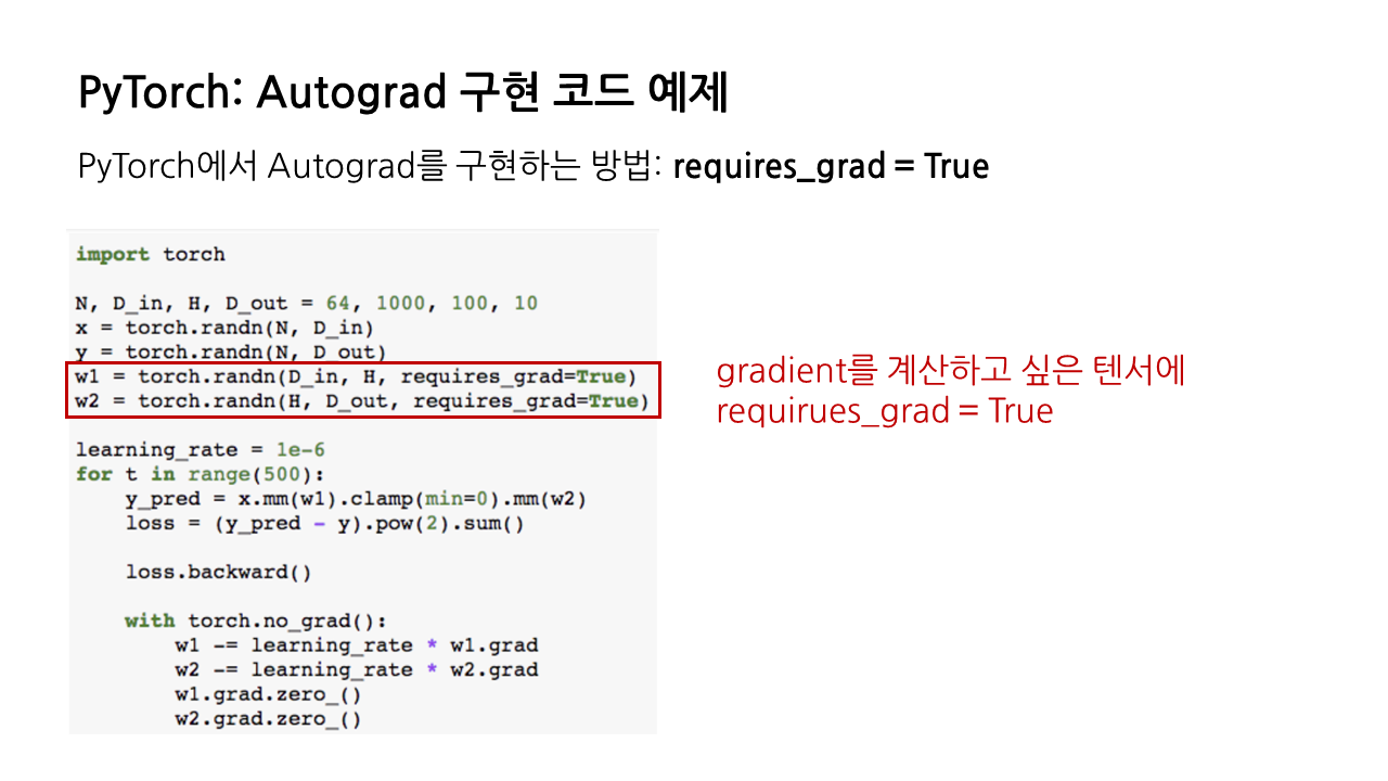 Autograd 기능은 PyTorch에서 매우 간결하게 구현할 수 있다. gradient를 계산하고 싶은 tensor에 'requires_grad = True'라는 인자를 추가해주기만 하면 된다.