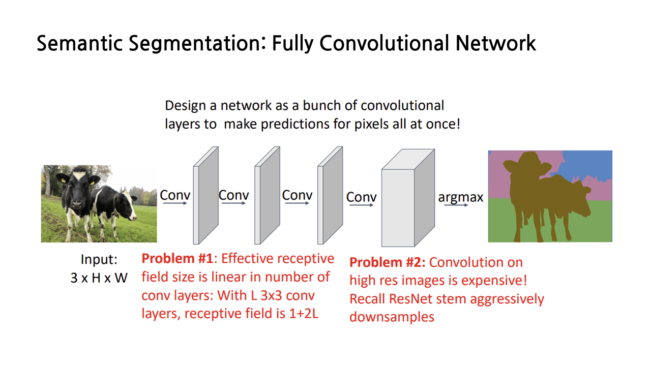 강연자께서 semantic segmentation task를 해결하는 ‘멍청한’ 아이디어라고 소개한 내용인데, 바로 sliding window다. 이는 이미지의 각 픽셀에 대해 그 주변부를 포함한 작은 patch를 추출하고, 그 patch들 각각을 CNN에 넣어서 라벨링을 하는 방식이다. 이걸 모든 픽셀에 대해서 계속해서 반복한다고 생각하면… 생각만 해도 아찔하다. 워낙 느리고 매우 비효율적인 방법이라 잘 사용하지 않는다.