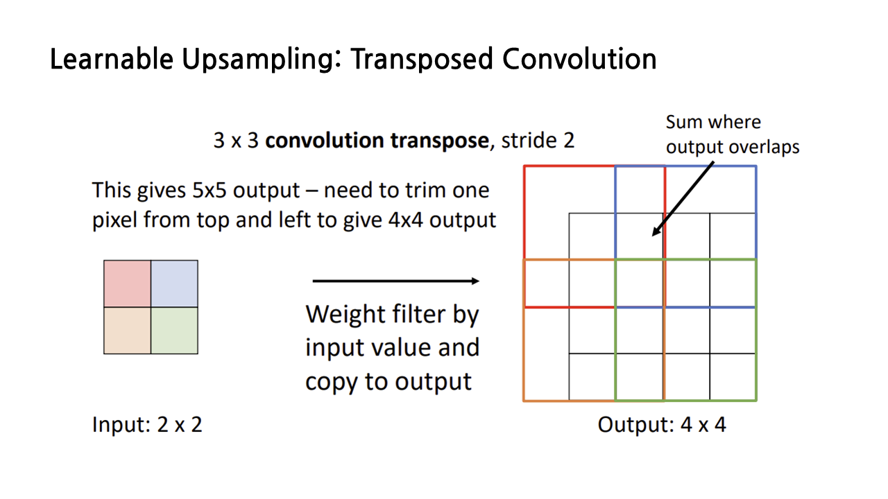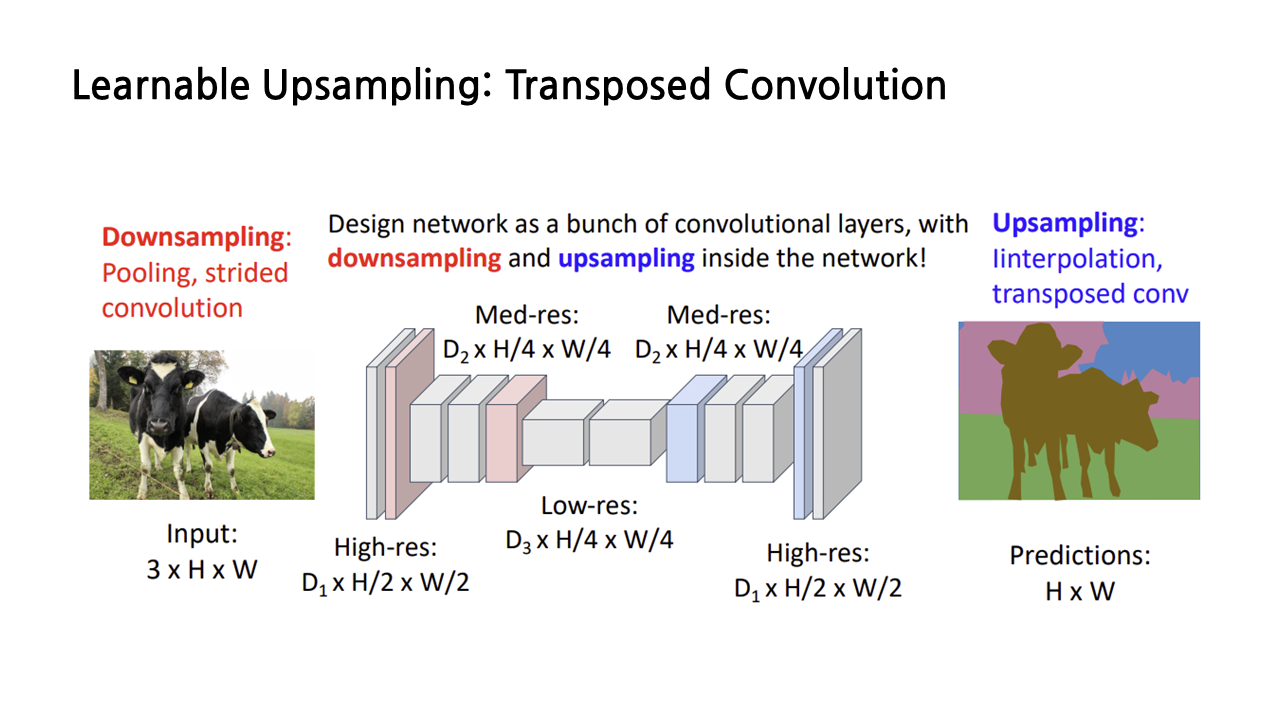 방금까지 본 upscaling 연산은 semantic segmentation의 과정 중에 수행되는 것으로, 앞서 다룬 interpolation, transposed convolution 등 여러 종류 중 적절한 것을 택해서 사용하면 된다.