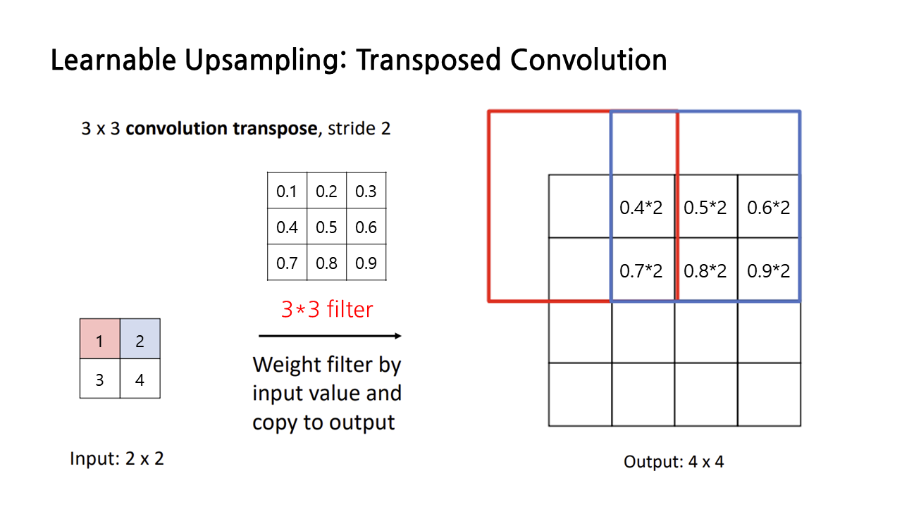 transposed convolution을 시각적으로 이해해보자. transposed convolution의 목표는 input보다 output의 크기를 키우는 것이므로, input feature들을 필터에 곱해서 더 큰 output으로 확장시켜야 한다. 아래 그림과 같은 filter와 input이 있을 때, input과 filter의 해당 부분을 곱해서 이런 방식으로 output의 각 칸을 채워 나가는 과정이 transposed convolution이다.