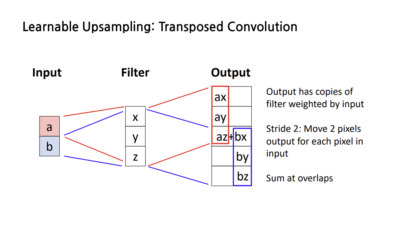그런데 downsampling을 하더라도, 결과물은 input 이미지와 동일한 해상도로 나와야 할 것이기 때문에 다시 upsampling을 해주어야 한다. downsampling은 pooling이나 stride 조절을 통해 할 수 있다는 걸 알고 있는데, upsampling은 어떻게 할까? 지금부터 upsampling의 방법에 대해 다루겠다.