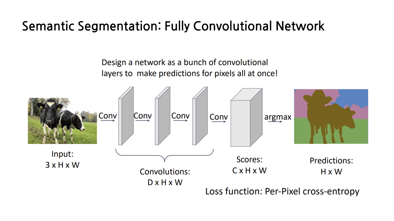 Segmentation에는 여러 종류가 있는데, 첫 번째로 semantic segmentation을 보겠다. 이는 이미지의 각각의 픽셀에 카테고리 label을 붙이는 것이다. Instance를 구분하는 것이 아니라 오직 픽셀에만 집중하기 때문에, 오른쪽 그림에서처럼 두 마리의 소가 붙어 있더라도 이를 소 1, 소 2로 구분하는 것이 아니라 ‘소’라는 하나의 카테고리 라벨로 통칭한다.