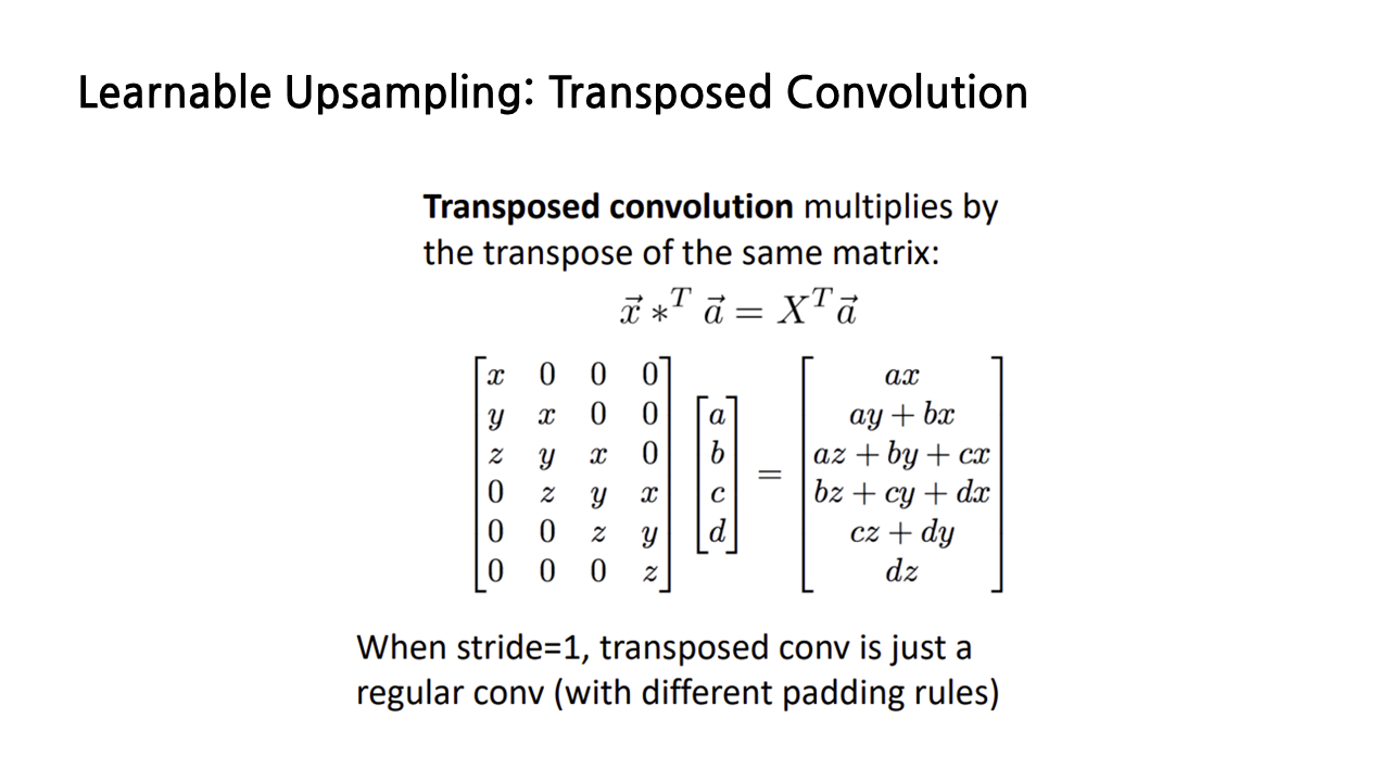 이 연산에 ‘transposed’ convolution이라는 이름이 붙게 된 이유는 convolution 연산을 matrix multiplication으로 나타내면 쉽게 알 수 있다. 이 슬라이드는 x y z로 구성된 길이가 3인 벡터 x와 a b c d로 구성된 a 사이의 convolution을 나타낸 것이다. 이때 x는 필터, a는 input에 해당하고, 벡터 a의 위아래에 있는 0은 zero padding을 의미한다.