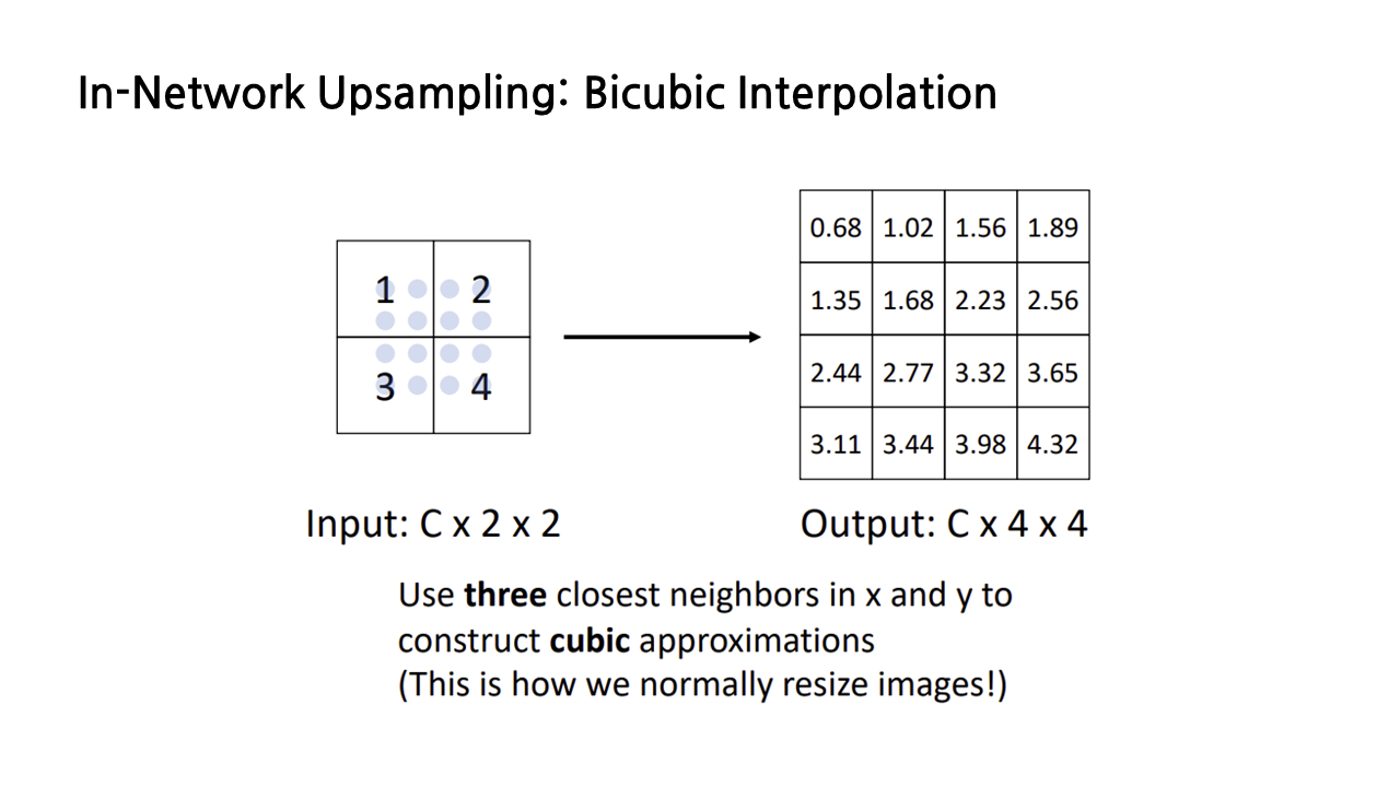강의에서는 bicubic interpolation에 대해 자세히 다루지는 않았는데, JPEG 이미지를 resizing하는 데 좋다는 것을 포함해 여러 장점이 있어 가장 보편적으로 사용되는 upsamling 방식이라고 한다.