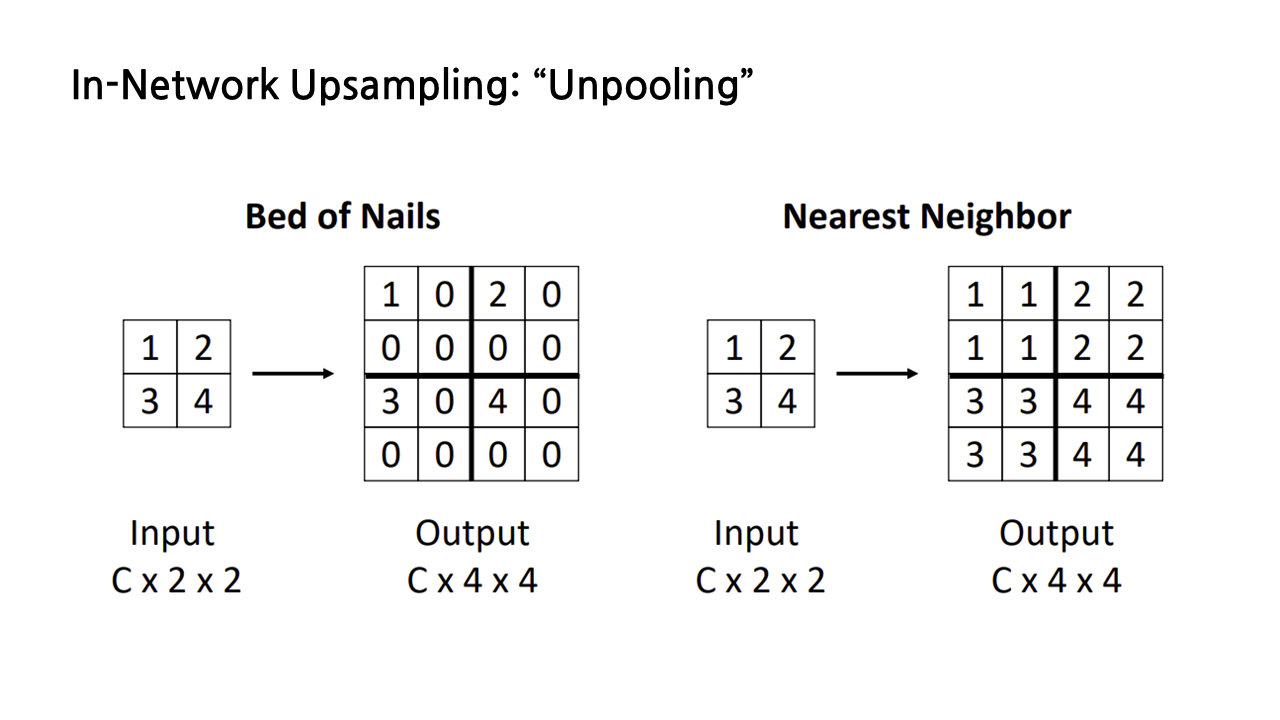 앞서 언급했듯이 pooling이 downsampling을 수행하게 해주는 방법이었으므로, upsampling을 수행하려면 그 반대인 ‘unpooling’을 하면 된다. unpooling을 하는 방법 첫 번째는 ‘bed of nails’라는 방식인데, 아래 그림과 같은 방식으로 왼쪽 위에 input feature들을 넣고, 사이즈를 키우면서 생긴 나머지 칸을 모두 0으로 채우는 방법이다. 딱 봐도 감이 올 테지만 그리 좋지 못한 방법이라 자주 사용하진 않는다고 한다.