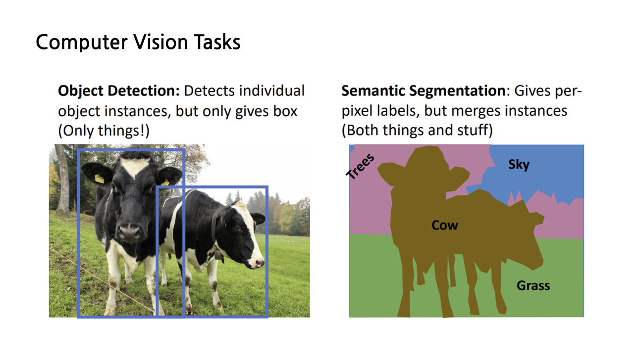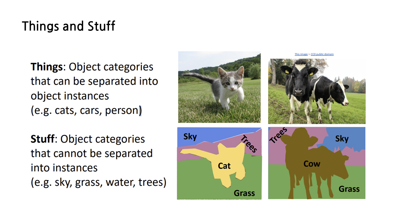 지금까지의 16강에서 object detection, semantic segmentation 등의 내용을 다루었는데, computer vision의 task는 아직 끝나지 않았다. 또다른 segmentation 방법을 소개하기에 앞서 things와 stuff에 대해 정의하고 가도록 하자. object는 크게 things와 stuff로 분류될 수 있는데, things란 instances로 나뉠 수 있는 object, 예를 들면 고양이, 자동차, 사람 등을 의미하고, stuff란 instances로 나뉠 수 없는 object, 일례로 하늘, 풀, 물, 나무 등이 이에 속한다.