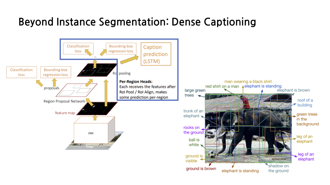 그밖에도, faster R-CNN의 뼈대에 caption prediction을 위한 LSTM 모델(자연어 처리-NLP- 분야의 모델_을 더해서 detect한 object에 대해 자연어로 설명을 덧붙일 수 있는 연구도 진행되었다.