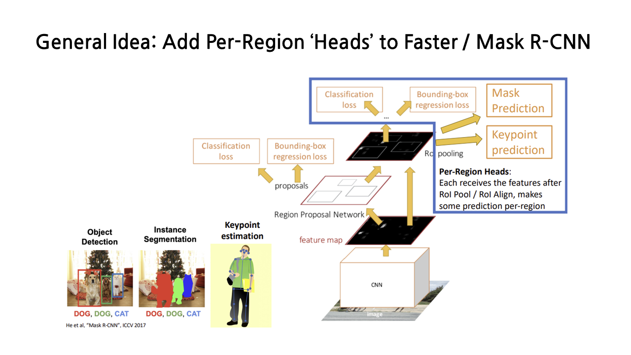 지금까지 설명을 들으면서 감이 왔겠지만, computer vision의 많은 task들은 이처럼 faster R-CNN이나 mask R-CNN에, 새로운 종류의 output을 낼 수 있도록 특화된 추가적인 ‘head’를 붙임으로써 수행할 수 있다.