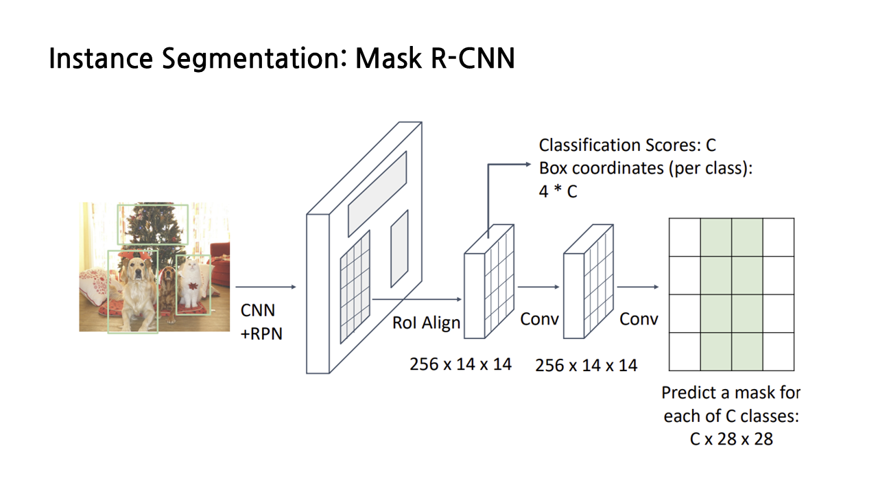 이후 segmentation mask를 예측하기 위해 앞서 과정을 통해 detect한 object에 대해 semantic segmentation network를 수행하게 되는데, 이것도 이미 배웠던 내용이다. 차이점이라면 전체 input image가 아니라 object detection을 통해 추출한 object에 대해서만 semantic segmentation을 수행한다는 것이 다를 뿐, 지금까지 배운 object detection과 semantic segmentation의 조합이라고 보면 된다.