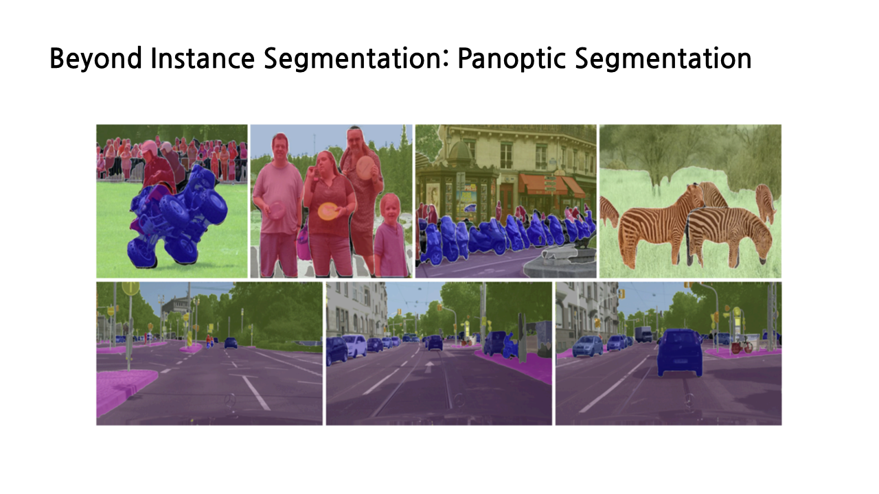 여기서부터는 좀 더 발전된 형태의 segmentation task를 가볍게 소개하는 시간이니 편하게 보면 될 것 같다. semantic segmentation과 instance segmentation을 합친, things와 stuff 모두에 대해서 labeling을 해주면서 각각의 instance를 구분까지 할 수 있는 panoptic segmentation도 존재하는데,
