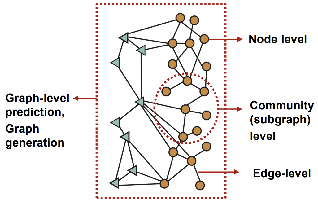 지난 글, 1-1. Why Graphs에서도 잠깐 언급한 바 있지만, 그래프에 대한 딥러닝 모델링에서 output인 prediction은 여러 수준에서 이루어질 수 있다. 개별 node level일 수도 있고, edge(pairs of nodes) level일 수도 있고, community(subgraph) level일 수도, graph 혹은 graph generation level일 수도 있다. 아래에서 각각 level에서의 task가 무엇이 있는지, 그 응용 사례에는 어떤 것이 있는지 소개하겠다.