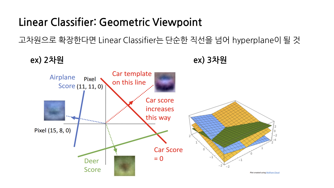 방금은 픽셀 두 개만 고려한 2차원 상황을 생각했지만, 이를 고차원으로 확장한다면 linear classifier는 단순한 직선을 넘어 hyperplane으로 표현될 것이다.