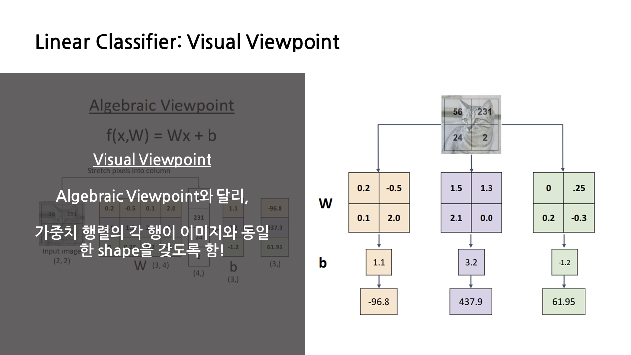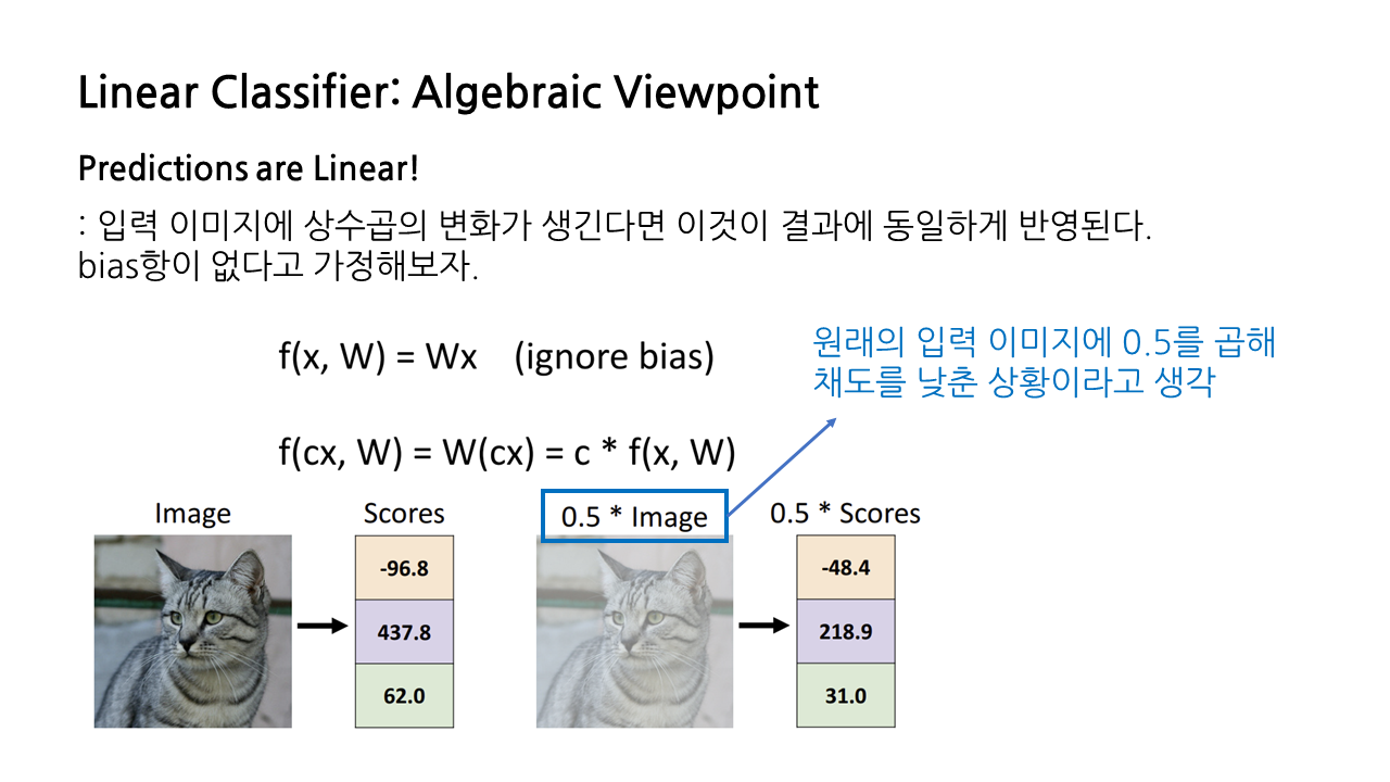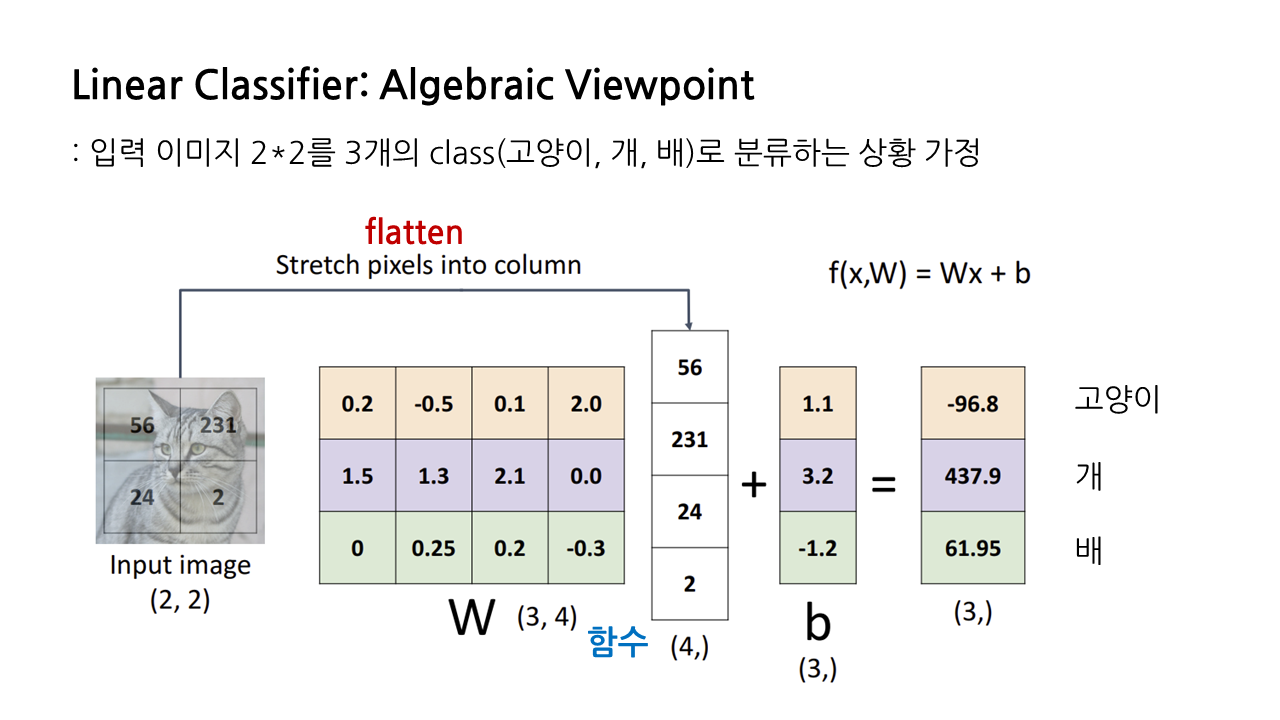 지금부터 다룰 것은 linear classifier를 바라보는 세 가지 관점 중 첫 번째인 'Algebraic Viewpoint', 즉 대수적 관점이다. 표현은 그럴싸하지만 사실상 선형대수 계산이라고 생각하면 된다.