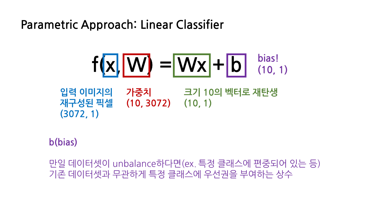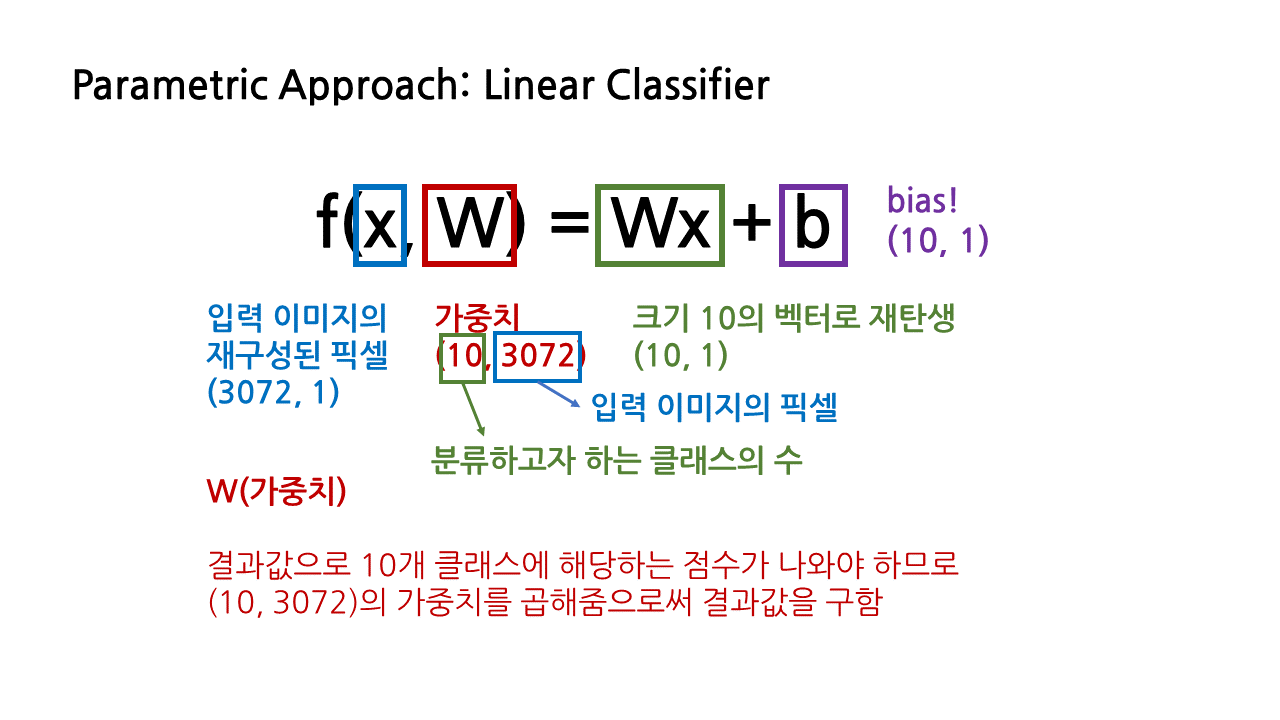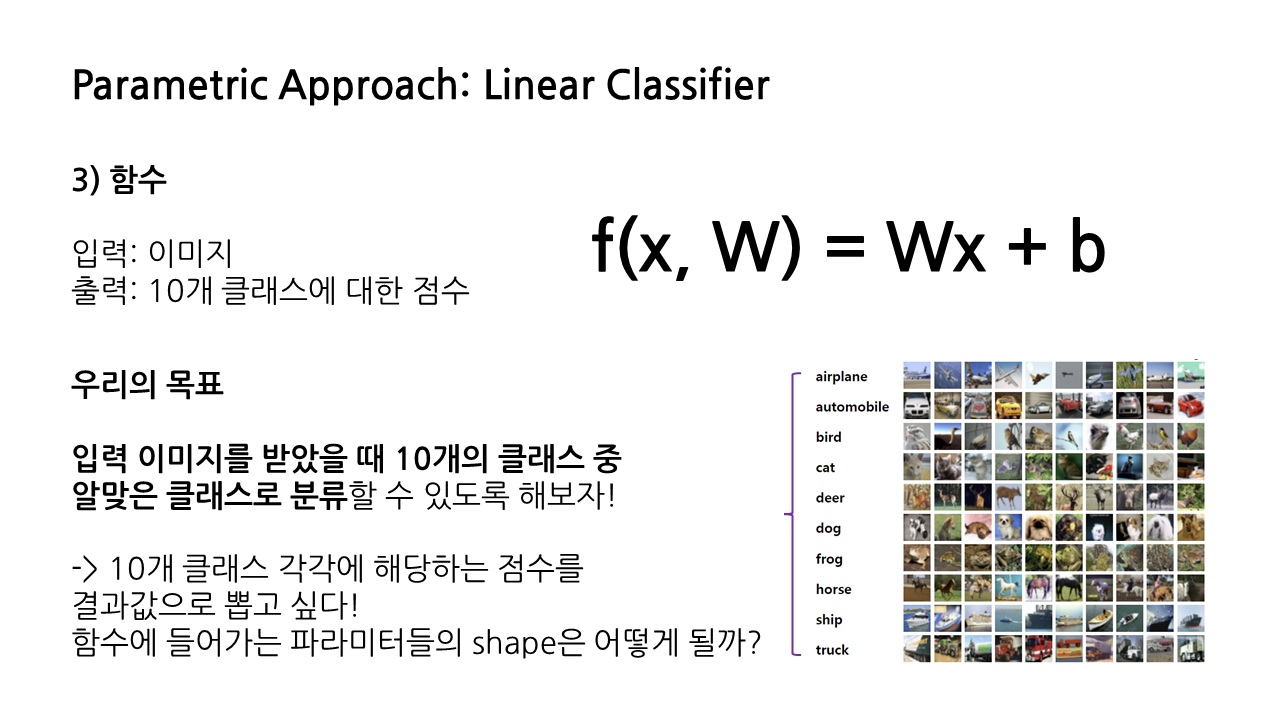 이는 모든 데이터를 저장하는 것이 아니라 파라미터 값만 저장하는 방식으로, 이를 적용한 모델의 가장 단순한 형태가 바로 오늘 공부할 linear classifier이다. 그 반대는 모든 데이터를 저장하는 방식의 non parametric approach로, 그 예시로 kNN을 들 수 있다.