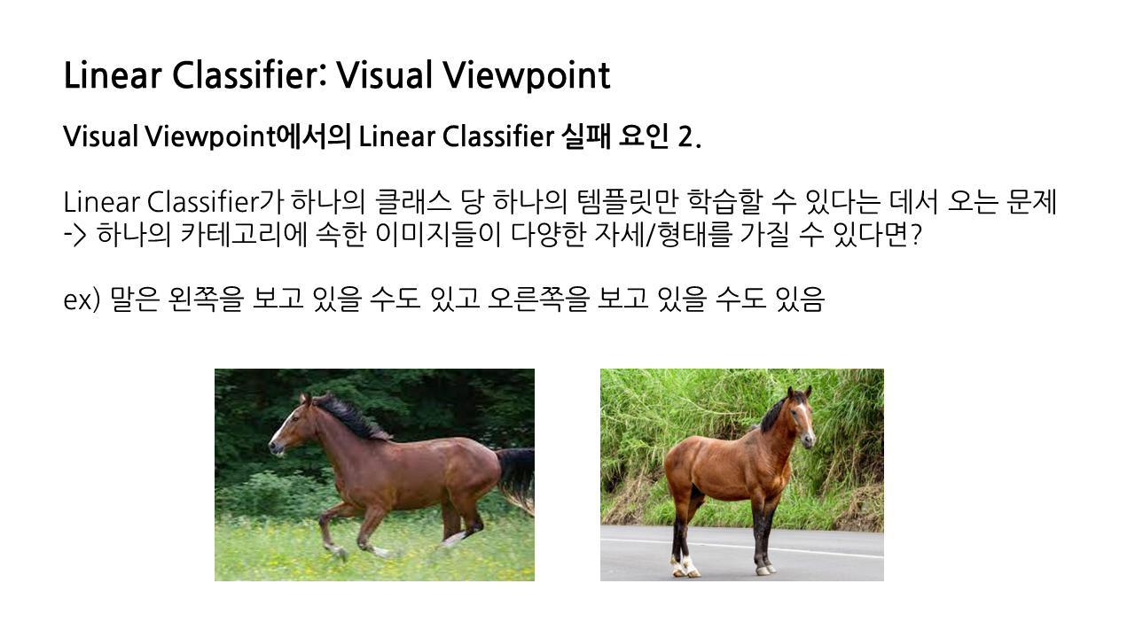 만일 하나의 카테고리에 속한 이미지들이 다양한 자세나 형태를 가질 수 있다면 어떻게 될까? 예를 들어 말은 왼쪽을 보고 있을 수도 있고 오른쪽을 보고 있을 수도 있는데, linear classifier는 서로 다른 방향을 보고 있는 말에 대해서 각기 다른 템플릿으로 학습할 수 없다.