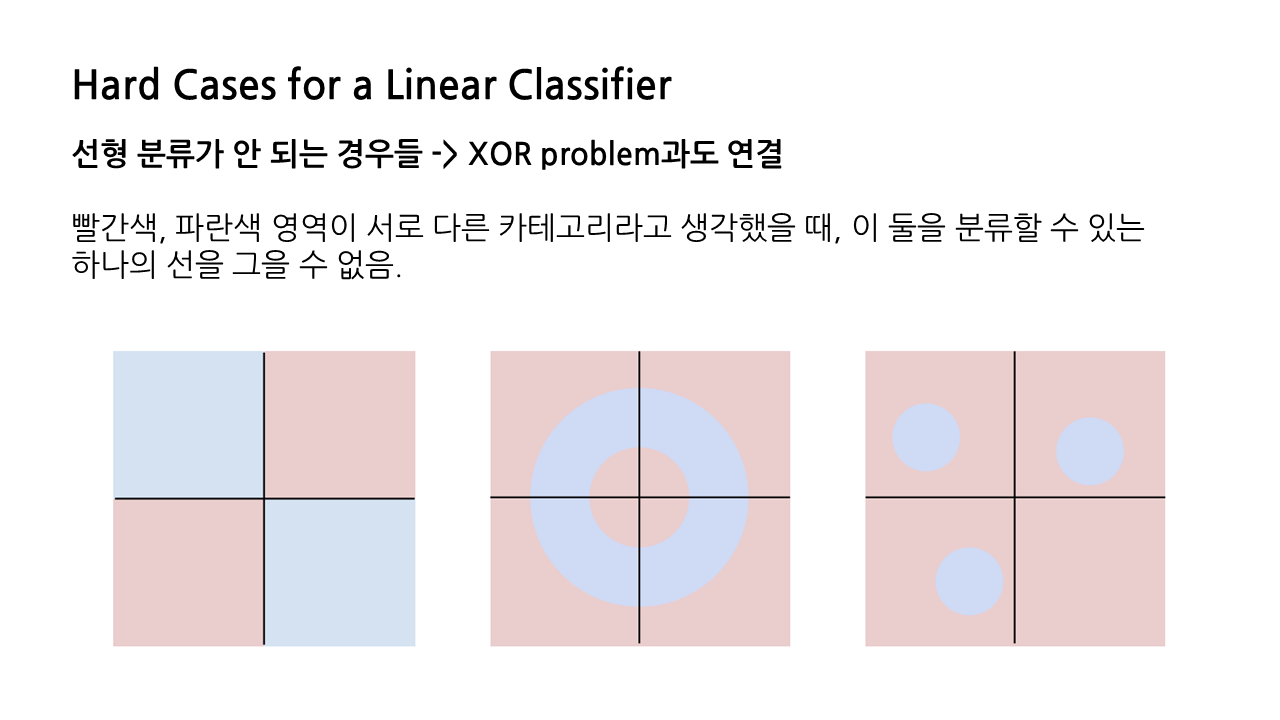 다만 linear classifier에는 명백한 한계가 존재하는데, 바로 선형 분류가 불가능한 경우에는 적용이 안 된다는 점이다. 그림에서 빨간색, 파란색 영역이 서로 다른 카테고리에 속하고, 이 둘을 분류하고 싶은 상황이라고 할 때, 하나의 선을 그어 둘을 구분 지을 수 있는 방법이 존재하지 않는다.