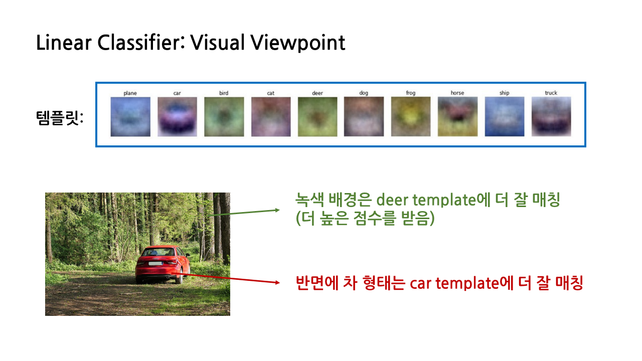 그런데 이렇게 각 클래스별 템플릿을 생성한다는 특징이 linear classifier의 실패 요인과도 연결된다. 일례로, 숲속에 주차된 차 이미지가 입력 이미지로 주어진다면 linear classifier에 혼돈을 불러일으킬 수 있다. 차 형태는 car template에 잘 매칭되는 반면, 녹색 배경은 deer template에 더 잘 매칭되기 때문에, linear classifier 입장에서는 이 이미지를 차로 분류해야 할 지 사슴으로 분류해야 할 지 헷갈릴 것이다.