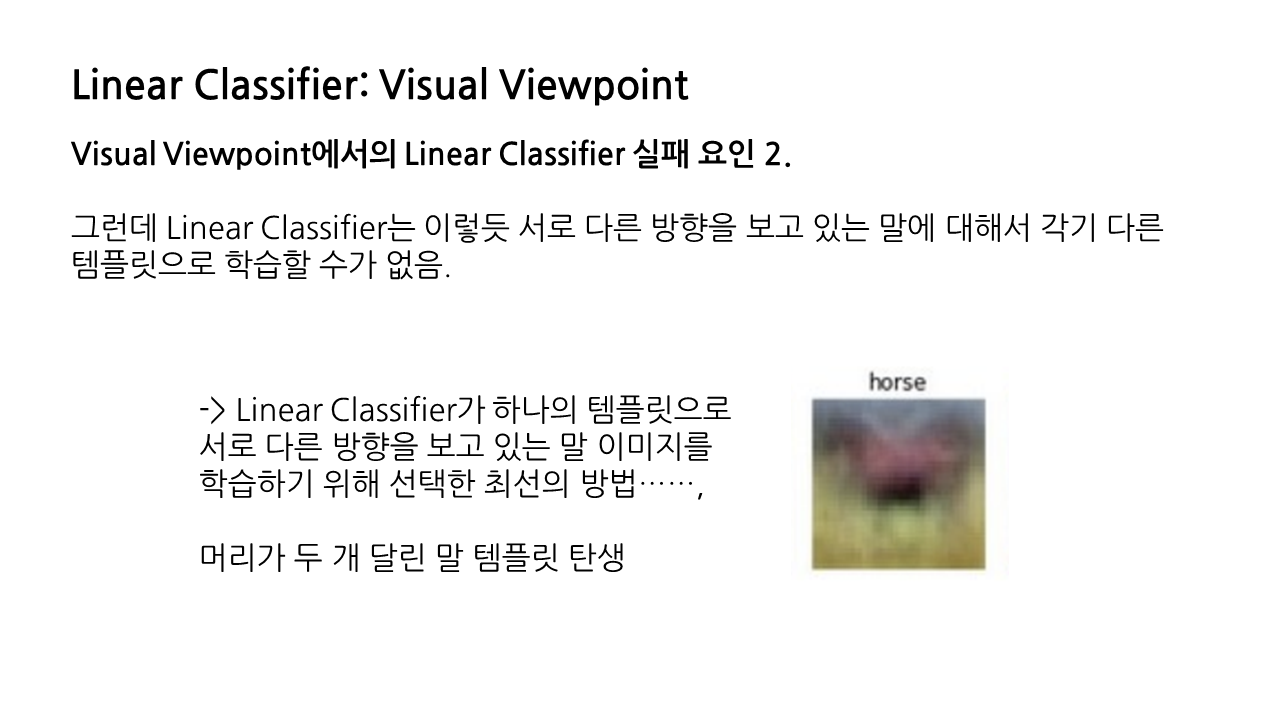 그래서 linear classifier가 하나의 템플릿만으로 서로 다른 방향을 보고 있는 말 이미지를 학습하기 위해 선택한 최선의 방법이 바로 머리가 두 개 달린 말 템플릿을 만드는 것이었다. 이는 확실히 문제가 있다.