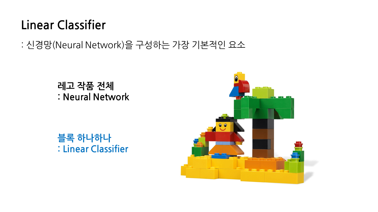 이는 앞으로 공부할 신경망(neural network)를 구성하는 가장 기본적인 요소로, 레고 작품 전체를 신경망이라 하면 그것을 구성하는 블록 하나하나가 linear classifier라고 볼 수 있다.