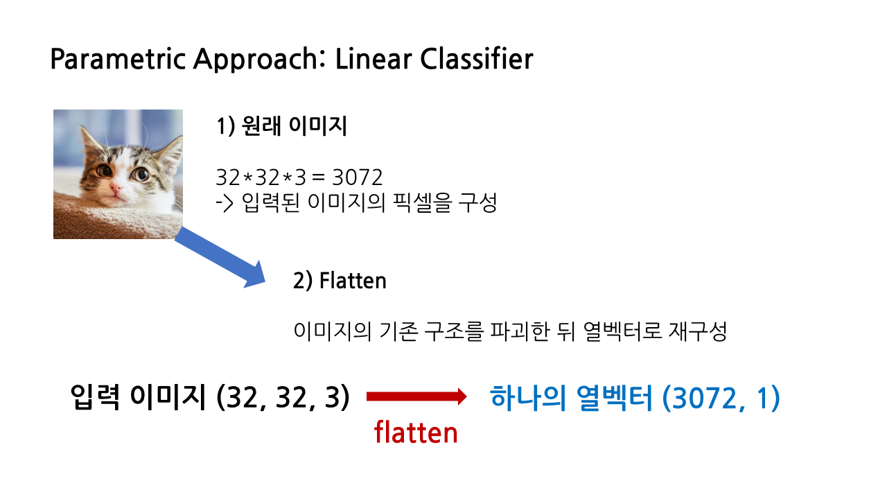 (2) flatten: 분류에 사용할 이미지 데이터셋인 CIFAR-10은 앞서 말한 것처럼 32*32*3 픽셀을 가지고 있는데, 우선은 이것을 (3072, 1)의 하나의 열벡터로 재구성한다. 이 과정을 'flatten'이라 한다.