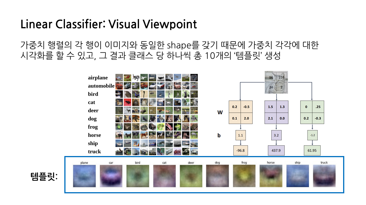 linear classifier를 바라보는 세 가지 관점 중 두 번째인 'Visual Viewpoint'에 대해 소개하겠다. 앞서 대수적 관점과는 달리 가중치 행렬의 각 행이 이미지와 동일한 shape을 가지도록, 즉 원래 이미지가 2*2였다면 가중치 행렬도 2*2가 되도록 하는 것이 visual viewpoint의 특징이다.