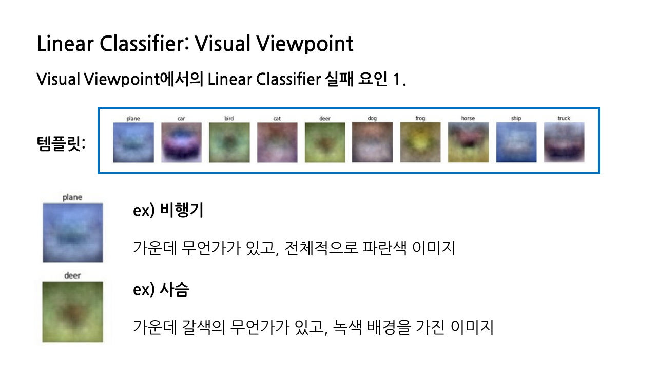 visual viewpoint에서 확인할 수 있는 linear classifier의 실패 요인이 하나 더 있다. 이는 linear classifier가 하나의 클래스 당 하나의 템플릿만 학습할 수 있다는 데서 오는 문제이다.
