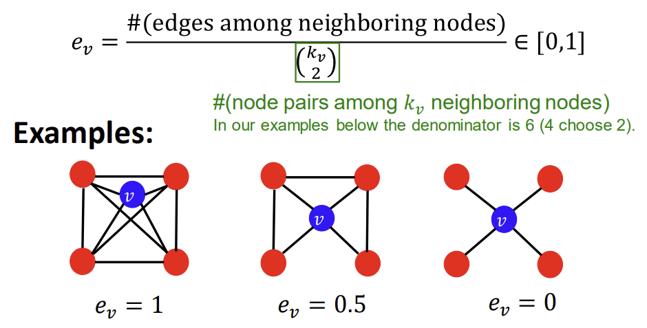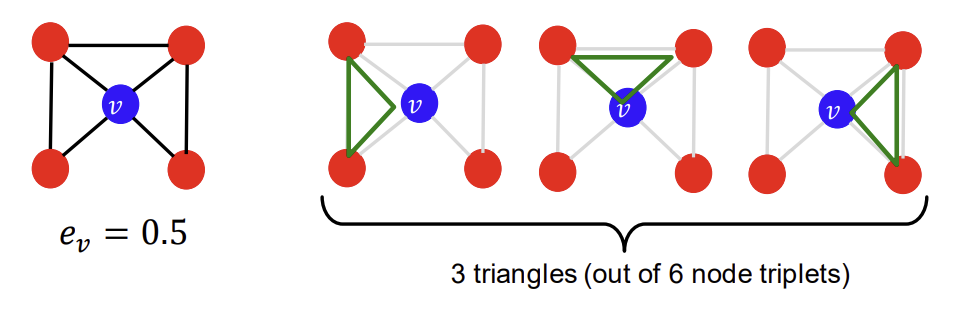 Clustering Coefficient는 어떤 node의 이웃들끼리 얼마나 연결되어 있는가를 측정한다. 식은 어떤 node v의 이웃 간 연결된 경우의 수를 이웃 node끼리 서로 짝을 지어 연결될 수 있는 전체 경우의 수로 나누어준다는 뜻이다. 이웃 노드끼리 모두 연결되어 있으면 clustering coefficient가 1, 모두 연결되어 있지 않다면 0이 된다.