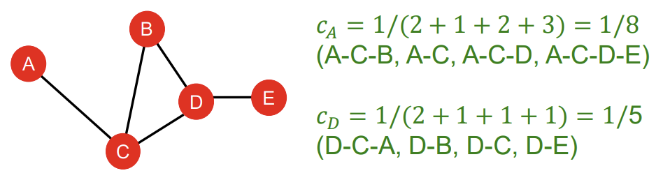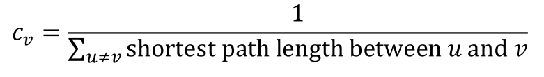 다른 모든 node와의 최단 경로 길이의 합이 작을수록 중심에 위치한 node일 확률이 크고, 따라서 더 중요하다는 아이디어이다. 식은 1 나누기 다른 모든 node와의 최단 경로 길이의 합으로 매우 간단하다.