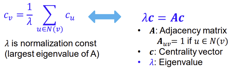 중요한 node와 더 많이 이웃해 있는 node가 중요한 node다! 라는 아이디어를 기반으로 한다. 이를 수식으로 나타내면 아래의 왼쪽 식과 같다. 이는 어떤 node의 중요도는 이것과 연결되어 있는 node들의 중요도의 normalized sum과 같다는 의미이다. 이 식은 오른쪽의 eigenvalue-eigenvector problem처럼 변형이 가능하다. 이 equation을 풀면, Perron-Frobenius Theorem에 의해 largest eigenvalue $\lambda_{max}$는 항상 positive하고 unique하게 된다. 그리고 leading eigenvector인 $C_{max}$가 centrality를 나타내는 지표로서 쓰이게 된다.