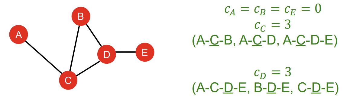 글로만 설명하면 잘 안 와닿으니 예시를 보도록 하겠다. Betweenness Centrality 관점에서 봤을 때, node A, B, E의 centrality는 0으로 같다. 반면 node C의 centrality는 3인데, A에서 B로 가는 최단 경로가 C를 거쳐야 하고, A에서 D로 가는 최단 경로도 C를 거쳐야 하며, A에서 E로 가는 최단 경로도 C를 거쳐야 하기 때문에 3이라는 숫자가 나온 것이다. 마찬가지로 D의 centrality 또한 3이다. B에서 E로 가는 최단 경로가 D를 거치며, C에서 E로 가는 최단 경로도 D를 거치고, A에서 E로 가는 최단 경로도 D를 거치기 때문이다.