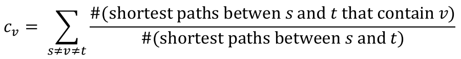 어떤 node가 교통의 중심지라면 중요한 node라는 아이디어다. 즉, 다른 node와의 최단 경로가 많은 node가 중요한 node라고 보는 아이디어이다. 이를 식으로 나타내면, 어떤 node v의 centrality는 해당 node v를 포함하는 다른 node s, t 사이의 shortest path의 개수를, s와 t 사이의 total number of shortest paths로 normalize함으로써 구할 수 있다.
